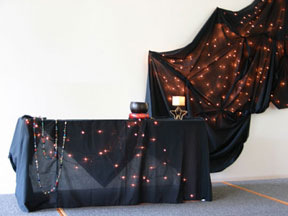 FLOWERS: Live Oak UU has been very successful at inspiring congregants to volunteer to bring in flowers for the sanctuary: members are phoned in anticipation of their birthdays and asked whether they would like to commemorate their birthday by bringing flowers to the sanctuary on the nearest Sunday; their name and birthday are then listed in the service bulletin. THEME ART: Some UU congregations have a different banner for each season hung across the sanctuary front wall. Some have a gorgeous piece of art that remains year-round and that fosters reverential meditation. Some have huge windows that allow congregants to gaze outdoors during the service without turning their heads. The UU of Traverse City MI has a very interesting approach to providing theme-based sanctuary art: A bare wall is at the front of the sanctuary, and a committee is in charge of decorating this wall (and the altar) each week. The individuals so involved seem to find this to be a major creative outlet, rather than a burden. Also, a "chalice" candle may be brought in, too, appropriate to the theme. For example, when we (Connie Barlow & Michael Dowd) led our Stardust Intergenerational Service there, the sanctuary had been decorated as seen below, with a star-shaped candle holder serving as the chalice.