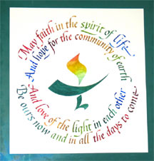 UU Society East (Manchester CT) recites in unison the same benediction every week while all join hands. Their innovation is that the benediction has been painted in lovely calligraphy (left) that hangs at the front of the sanctuary, so that no one needs to awkwardly read from the order of service and so that even newcomers can join in.