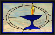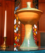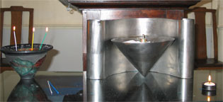 Striking a match or striking the flint of a butane lighter are inelegant and sometimes embarassing ways to light a chalice during a UU service. Many congregations have taken to lighting before the service a tiny flat candle that comes in a little tin, and hiding this "starter" candle behind the main chalice. During the actual chalice lighting a taper candle that is lying alongside is lit from the small flame, and then the taper candle is used to light the chalice flame. (The UU Fellowship of New Bern NC hides the little candle inside a beautiful ceramic container, and then simply puts on the lid to starve the flame of oxygen after the chalice is lit.) Beautiful and error-free! This is the only way that a child can light a chalice or that a parent can light the chalice with a babe or toddler in arm. Below (left) is the "silver" chalice setting that shows this useful arrangement at the UU Fellowship of Laguna Beach CA. Right is the chalice (with lit candles of sharing) at the UU Church of the Palouse in Moscow ID. Note: If there are 2 services on a Sunday morning, make sure you use a new starter candle, or the original might burn out before the chalice is lit for the second time.![]()