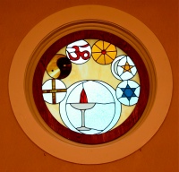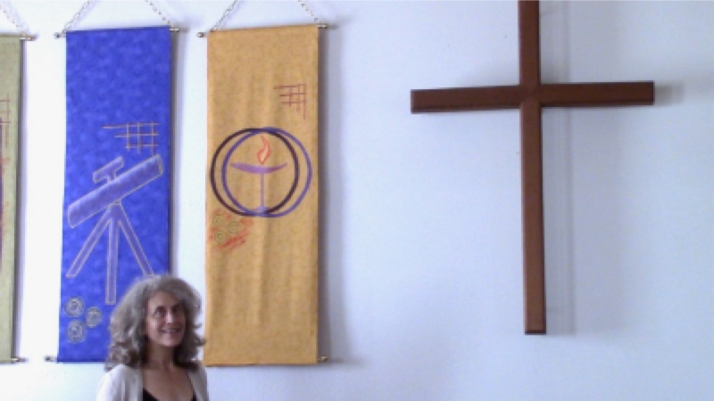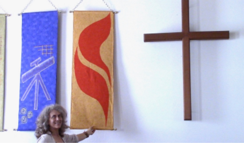 QUICKLY SETTING UP UU SYMBOLS IN RENTED CHURCH SANCTUARY. Photos below show how the Unitarian Universalist Community of Lake County (CA) sets up the sanctuary in the old Methodist church sanctuary it rents, late on Sunday morning (after the Methodist service). The UUs created banners for the front. All banners remain on the wall at all times, but all are flipped to the reverse side when UUs are done with their service. All except the UU Flaming Chalice banner are just blank on the reverse side. The Flaming Chalice flips (as shown) to reveal the red Methodist symbol.