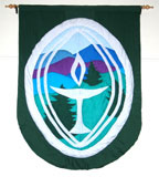 L: quilt at UU Fellowship of Salina, Kansas R: stained glass window at Westside UU of Rio Rancho, NM