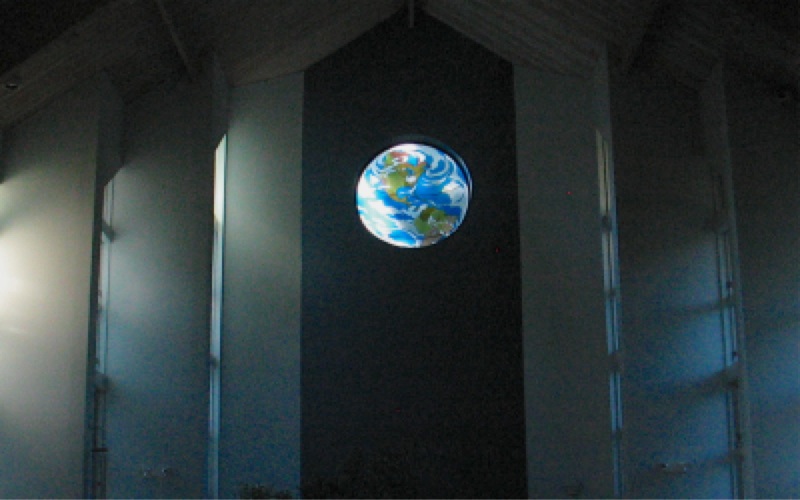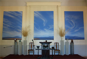 LEFT: Bioregionally attuned art on permanent display in the sanctuary of the UU Church of the Palouse in Moscow Idaho, home of rich glacial soils now dedicated to growing wheat. RIGHT: View from the pews toward the head of the sanctuary at UU of Monmouth County, Lincroft NJ.