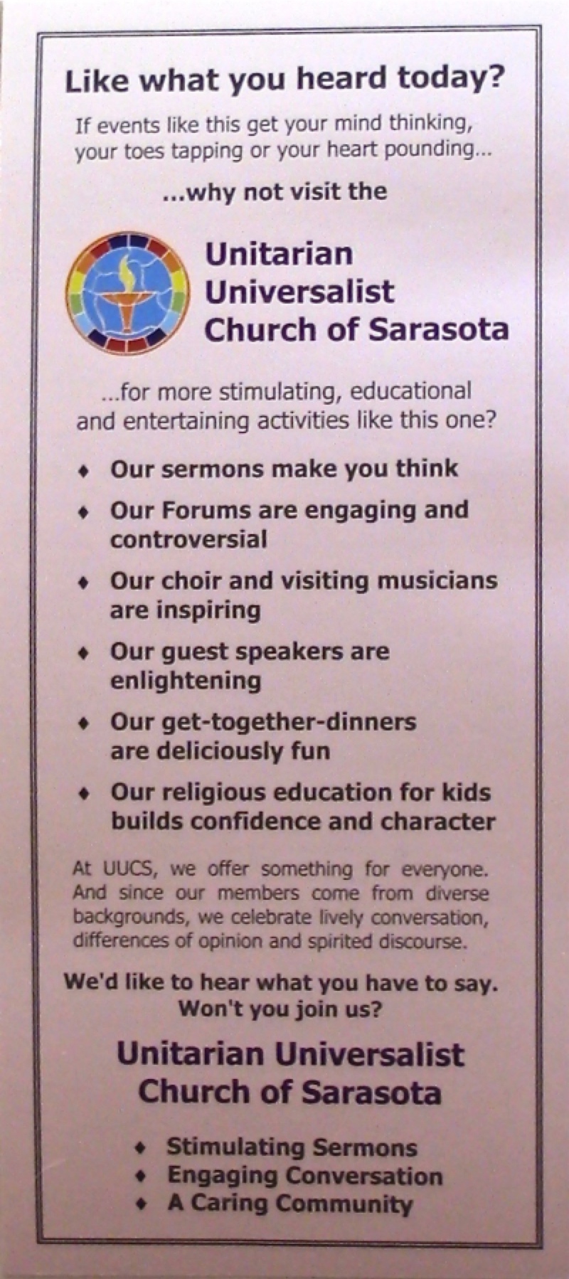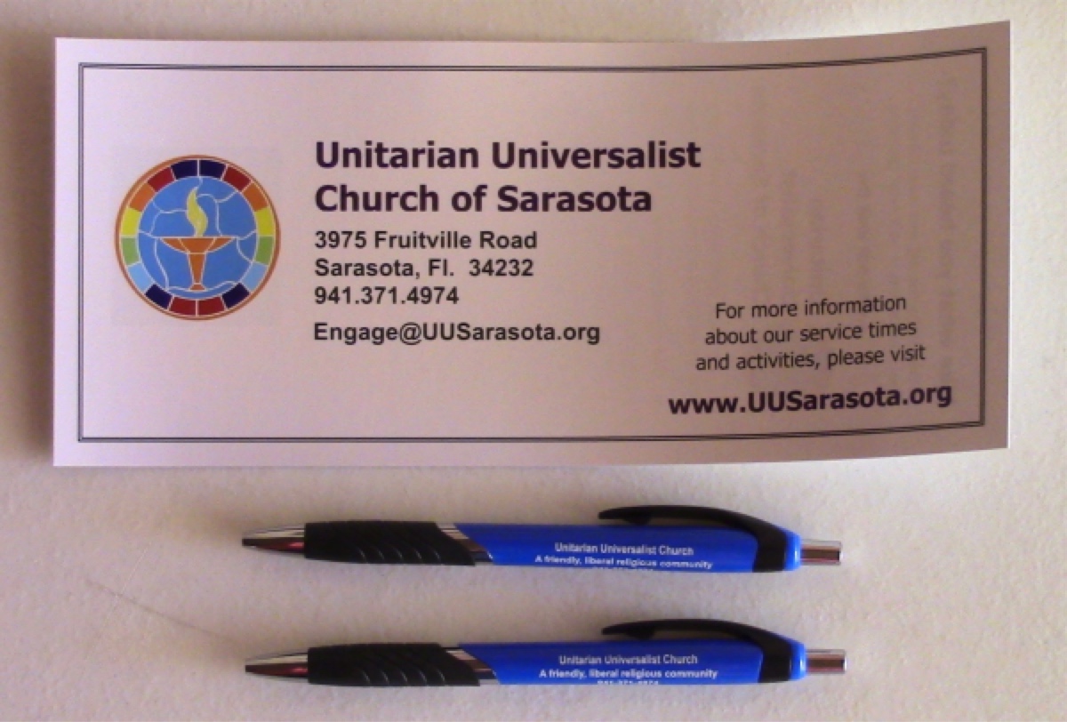 PHOTOS ABOVE: UU Church of Sarasota Florida conducts welcoming of visitors in the way begun by their minister, Rev. Roger Fritts. The service begins with an Opening Hymn, Opening Words & Chalice Lighting, Introit music, then Welcome and Announcements. The worship leader asks visitors to raise their hands and then walks in the aisles, never letting go of the mic, while asking each person for just their name and where they are from. The minister then repeats just WHERE THEY ARE FROM, using the mic. An assistant follows along with a basket to then give that person a pen and a plasticized card with info front-and-back as shown above. (The second line on the pen is "A friendly, liberal religious community".)