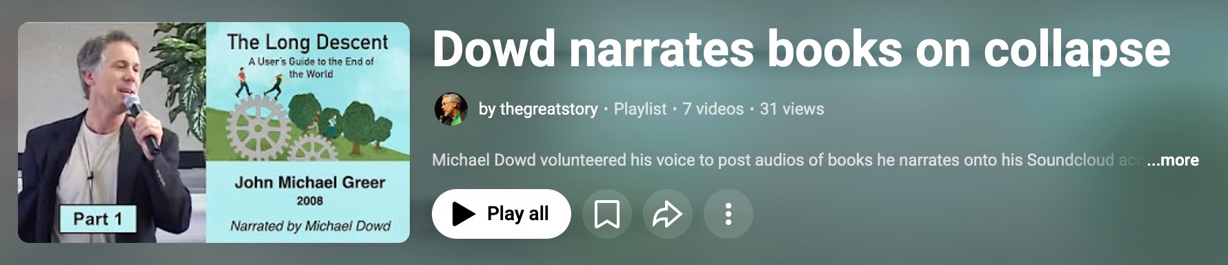 Key references to the wisdom of others (with image overlays) include William R. Catton, Paul Kingsnorth ("Dark Mountain Manifesto") and John Michael Greer. Audios Michael recorded of all three authors are posted on his Soundcloud page - "Michael Dowd: RIP Homo colossus", with table of contents here.
