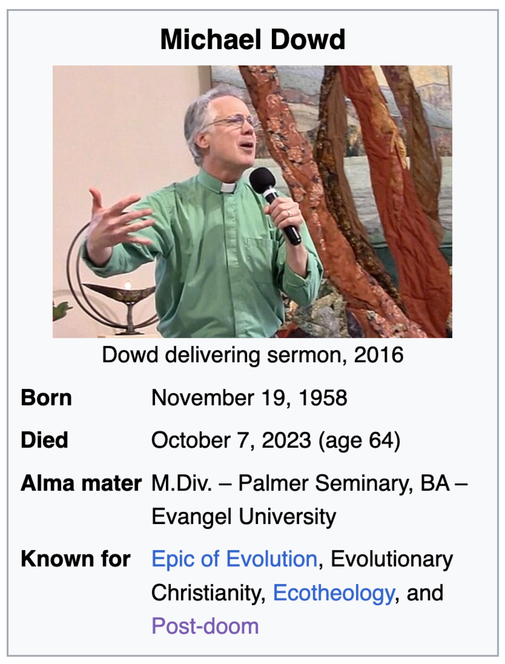 This is surely his BEST SERMON where the two halves of Thomas Berry's teachings bear equal weight: Evolution and Ecology. After this point, Dowd's growing sense that systemic change is an absolute necessity to avoid civilizational collapse makes ecology his primary emphasis.