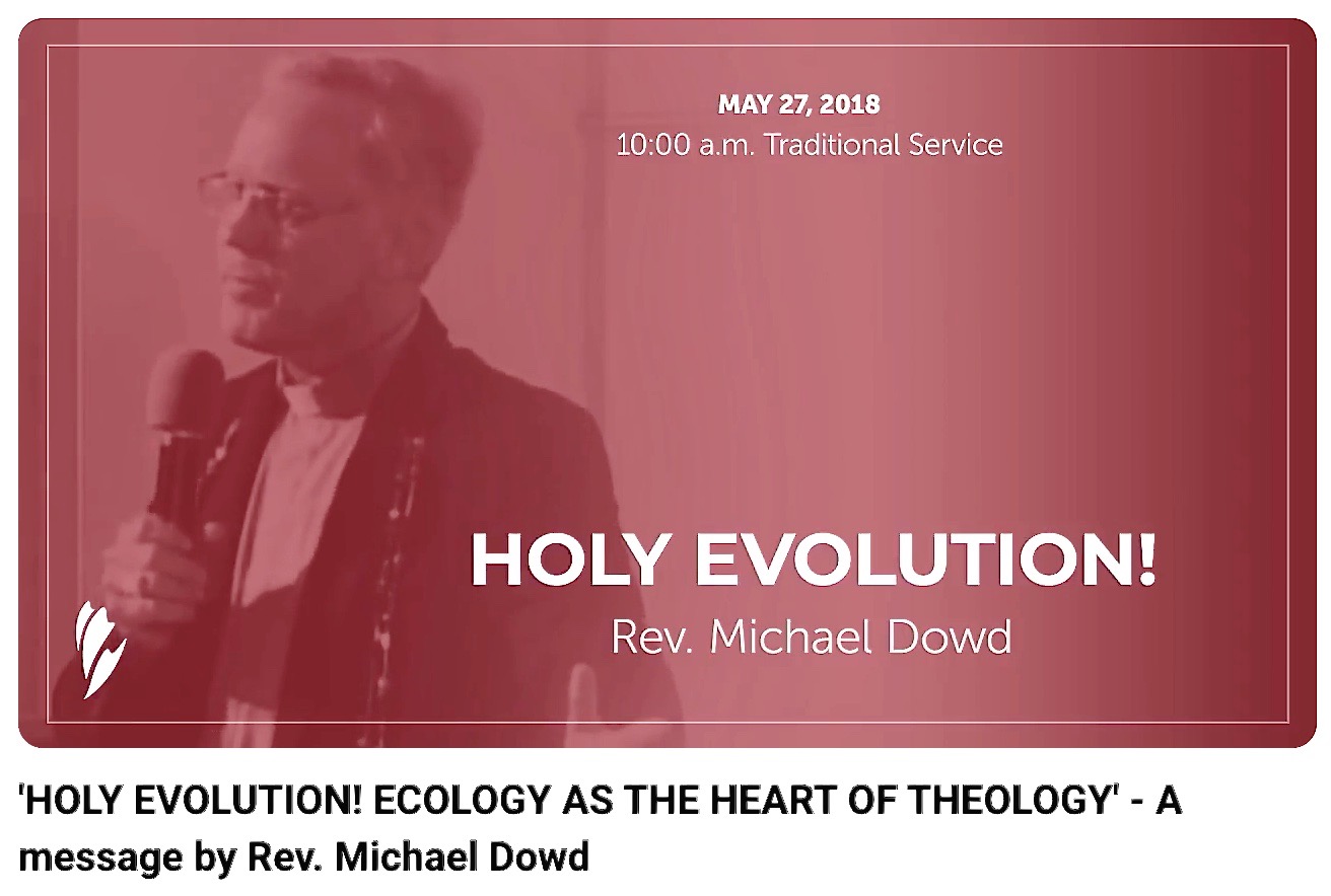 Rev. Dowd's 27 May 2018 guest sermon at the All Souls Unitarian of Tulsa (Oklahoma) combines his long-time focus on evolution with his growing concern for churches to "preach" ecology before it is too late.