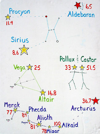 Star distances are measured in light-years: the distance over which light travels in one year (a little less than 700 trillion miles). The numbers in the chart above are light-year distances for stars close enough to our own solar system to serve as "birthday stars" or "anniversary stars" in the human lifespan. For example, Arcturus (at 36.7 light years away) is the birthday star for those 36 or 37 years old. It is easy to find because it is so bright, it is a distinctive reddish hue (being in its "Red Giant" phase of life), and one can easily find it by "arcing to Arcturus" along the curvature established by the handle of the BIG DIPPER.
