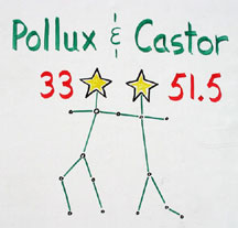 The next increment in age, using only very easy-to-find stars, provides birthday stars for those age 33 and 51 or 52. POLLUX and CASTOR mark the heads of a prominent late-winter / early spring constellation: GEMINI. For those age 54, a birthday star can be found in the constellation Cassiopeia, which is the big W in the late summer sky. The star's name is "Caph", and it is found as the right-most star in the W.