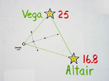 DENEB makes the third point in the Summer Triangle; it also marks the tail of the long-necked CYGNUS THE SWAN. Why doesn't the chart above show Deneb in big type? Because Deneb cannot be a birthday star: Deneb is 1600 light years away; we can see it only because it is a huge star and thus burns 60,000 times more brightly than does our Sun!