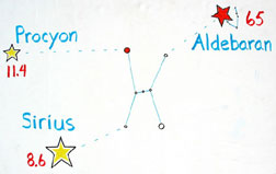"The photons of light from Sirius reaching your eyes today began their journey, exploding out of that star, in the very year you were born. This is how Sirius looked when you were born. So we are looking back 8 years into the past. This means that we cannot know what Sirius really looks like today. So it would be as if the only way we could see you today would be by looking at your baby picture. This means that Sirius is your "birthday star" this year, but it will not be your birthday star next year. Every 8 year old gets to have Sirius as their birthday star. When you are 9 and 10, there are no bright stars easy to see that are 9 or 10 light years away. You will have to wait until you turn 11. Then Procyon will become your birthday star." (Help them find Procyon, and also the stars in Orion. Explain why no star in Orion can ever be a birthday star.)"And you are the first generation to ever be told that there is a birthday star for you. Scientists couldn't measure light-years distance when your great grandparents were your age. And even though your grandparents and parents could have been told this; they weren't, because this new scientific discovery had not yet been brought into everyday life. Nobody had thought before about how this discovery means that we can find birthday stars in the sky."