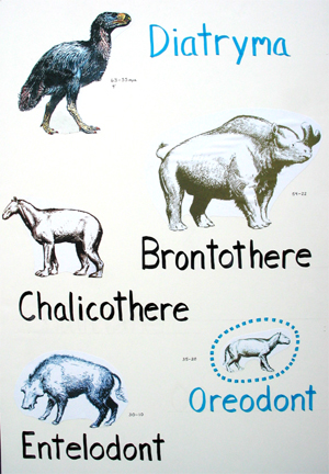 Oreodont - Small, sheeplike creatures that were abundant good food for carnivores from 35 to 20 million years ago. They evolved in North America and never spread beyond this continent (hence the turquoise circle).