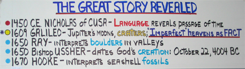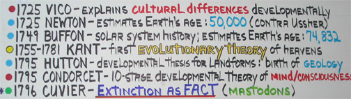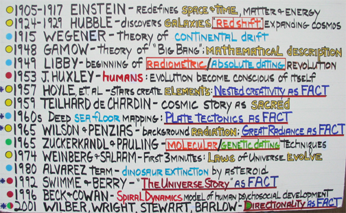 Major discoveries revealing the depths of time and the major events in the 14 billion year story of cosmic, Earth, life, and human cultural creativity. Red signifies discoveries in human culture; turquoise the Earth sciences, green the life sciences, and yellow the astronomical sciences. Dark blue (with red underline) highlights the key episodes that brought about huge new factual understandings. (Michael Dowd and Connie Barlow constructed this list from various sources.)Return to main list of Great Story CHARTS.