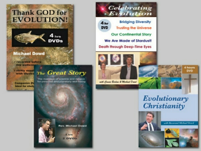 Here is a gift idea that will also help us immensely: Burn copies of our DVDs for others. Deepen your knowledge of The Great Story and share an inspiring evolutionary perspective with your friends and family by purchasing one or more of our DVD sets and then making as many copies as you wish. Duplicate them yourself or have Kinkos do it for you. PDFs of the DVD jacket graphics can be downloaded from the DVD purchase page (linked below) and you can purchase blank DVD cases at Staples, Office Depot, or OfficeMax. Burn as many copies of our DVDs as you'd like! For example, a minister from a large church in the Midwest bought two of our DVD sets and then had Kinkos make 35 copies of each, which became his Christmas gifts to the volunteer leaders of his church that year. Click here to access the reduced price page and order online: $25 per 4-hr set, rather than the standard $30 price. This offer is available to Evolutionary Times readers through the end of 2009.