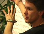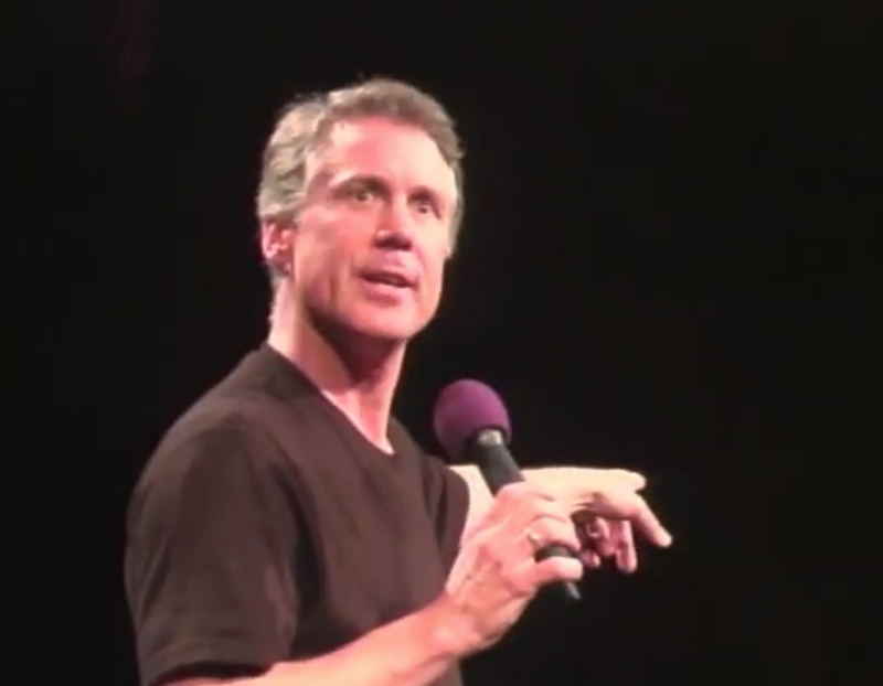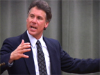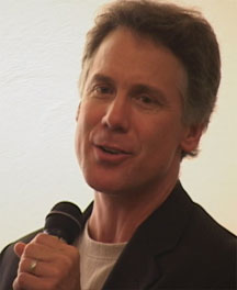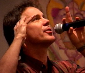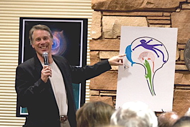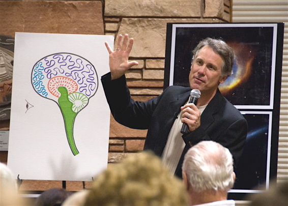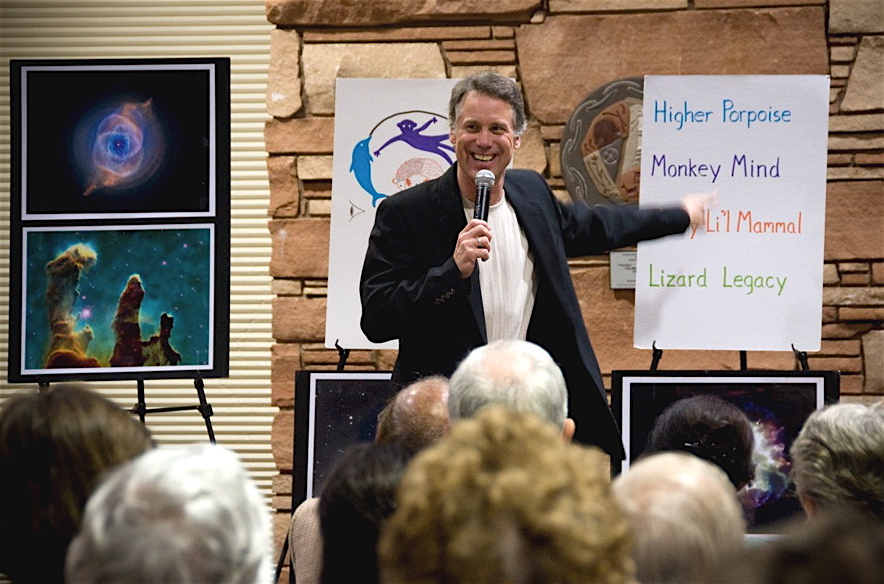 Michael Dowd preaching on an evolutionary understanding of original sin at North America's first evolutionary revival in San Diego, February 2008. An evolutionary understanding of original sin can be found in chapters 8 - 11 of his book, Thank God for Evolution!. The projected slide behind him in the photo presents playful names for the parts of our brain that reflect a deep evolutionary heritage: "Lizard Legacy" (brain stem and cerebellum); "Furry Li'l Mammal" (limbic system); "Monkey Mind" (neocortex); and "Higher Porpoise" (frontal lobes).