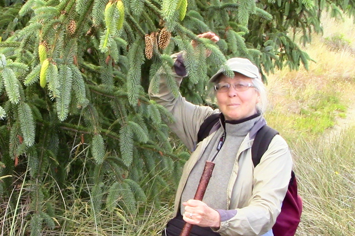 Connie Barlow shows the lush branching structure of the spruce in this full-sun (and full-fog) habitat. There will never be old-growth spruce here. Tsunamis regularly push the reset button.![]()
