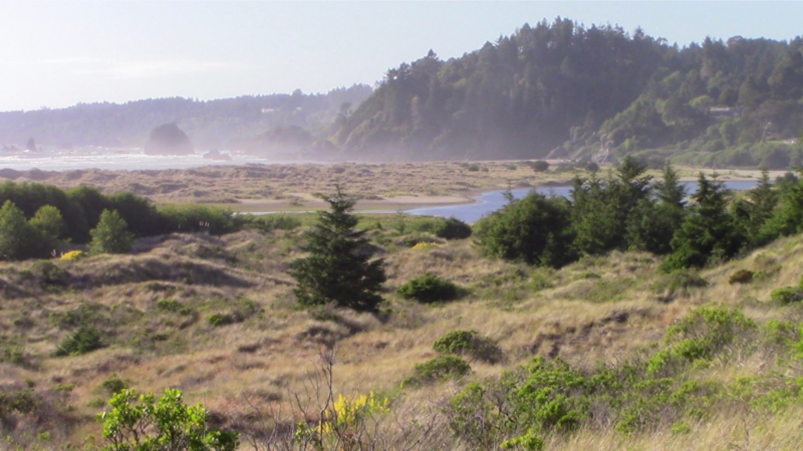 BELOW: Evidence of Sitka Spruce's capacity to tolerate salt spray can be found along the coast where the rise of land is made gradual by the outflow of a great river (Little River). Here, north of the coastal town of Arcata, a young Sitka Spruce stands alone amid the dominant grasses and shrubs. The nearby dwarf forest is entirely spruce, too.