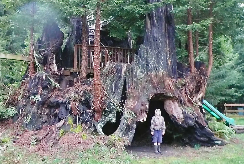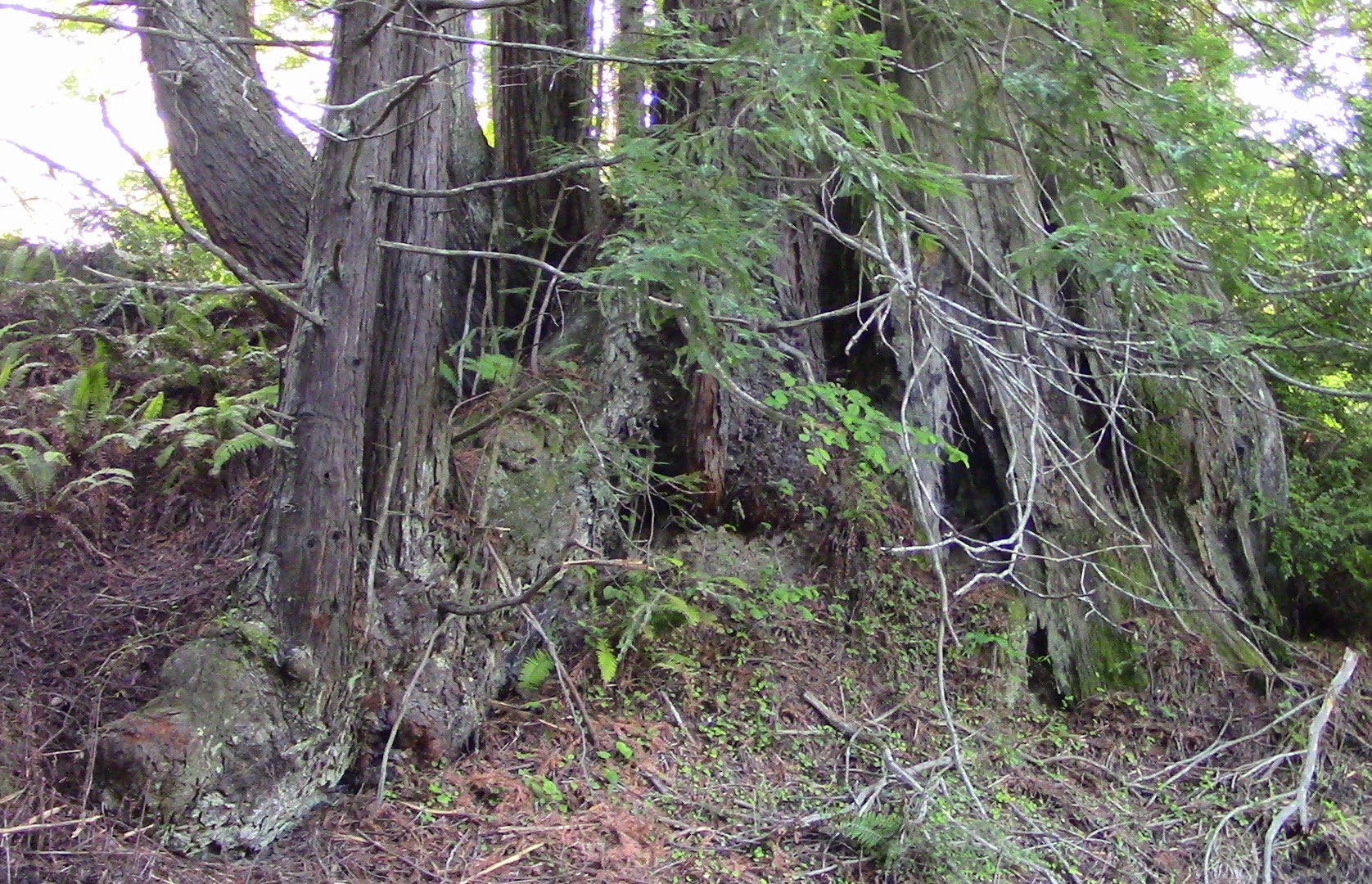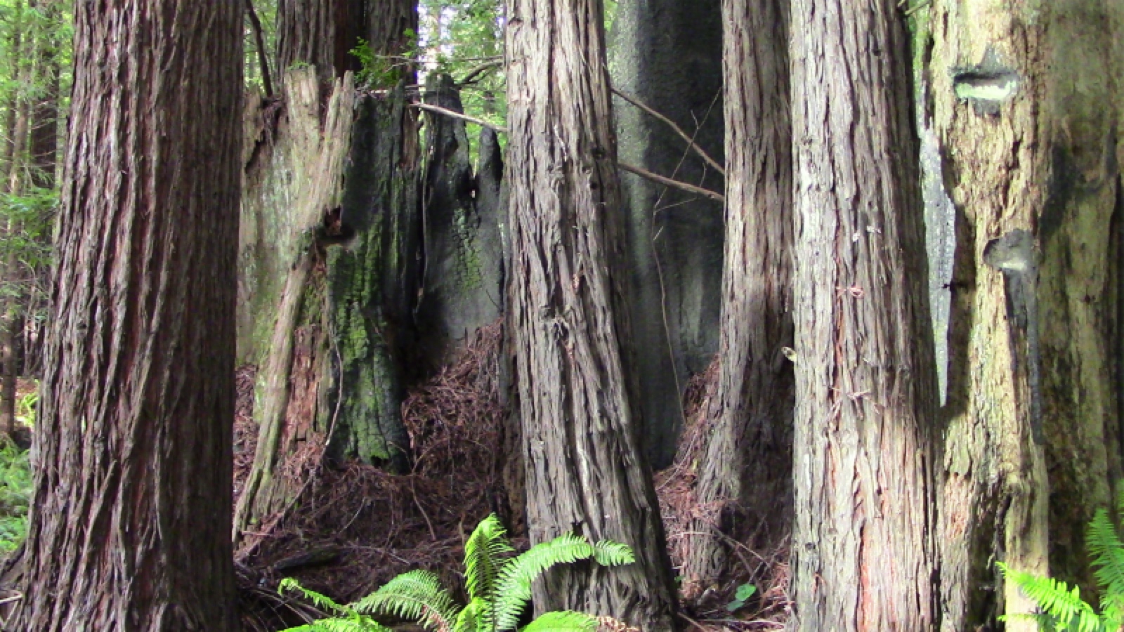 Two ancient stumps, light brown in color are visible in this photo. The stump at the right bears marks where once-deep holes were cut to hold the boards on which the sawyers stood. All the remaining stems are basal sprouts that rose up following the logging. Possibly the two stumps are close enough to have themselves been twin basals, arising after the original tree was topped by wind or killed by fire. The original tree would have lived long prior to the arrival of Euro-Americans.