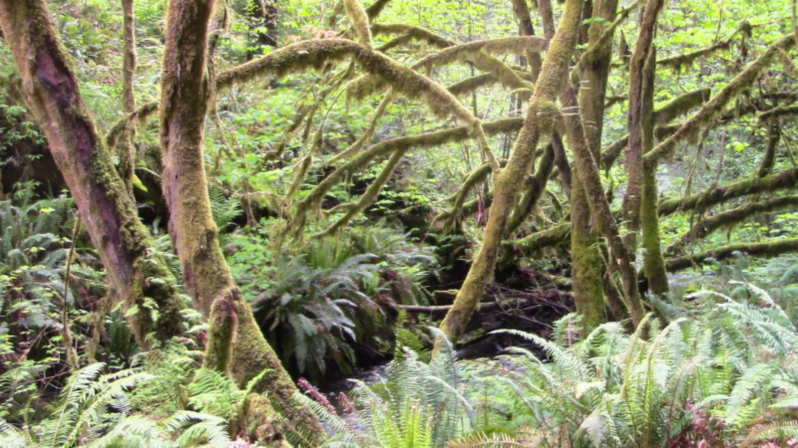 CANOPY INDICATORS: Western Redcedar, Western Hemlock, Sitka Spruce, and Bigleaf Maple all require access to adequate water. Douglas-fir is not a reliable indicator, and Pacific Madrone indicates conditions far too dry.SUBCANOPY INDICATORS: Lush SWORDFERN with fronds 3 feet or longer indicate ideal redwood habitat. In contrast, Salal is a common understory plant that indicates conditions too dry for redwoods.