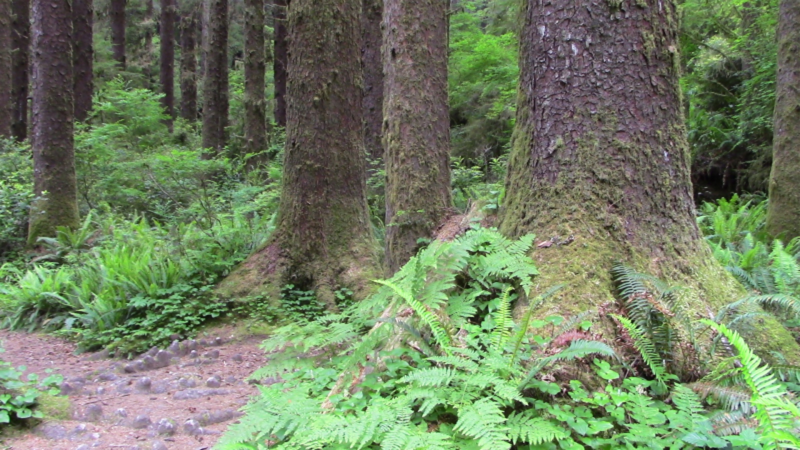 BELOW: Fern Creek Trail overland route begins nearly at tidewater; this zone is vulnerable to salt spray which Coast Redwood cannot tolerate. Hence, this early, low-elevation part of the trail is entirely Sitka Spruce. Spruce cannot grow basals but it can grow "knees" to help its roots breathe.