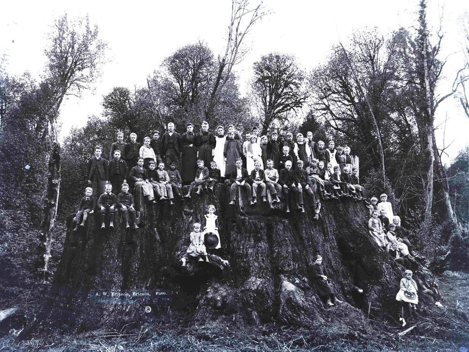 ABOVE LEFT: Project press release, October 2021.UPPER RIGHT: Historic photo of Fieldbrook Stump, near Arcata, from Ericson Collection, Humboldt State University.