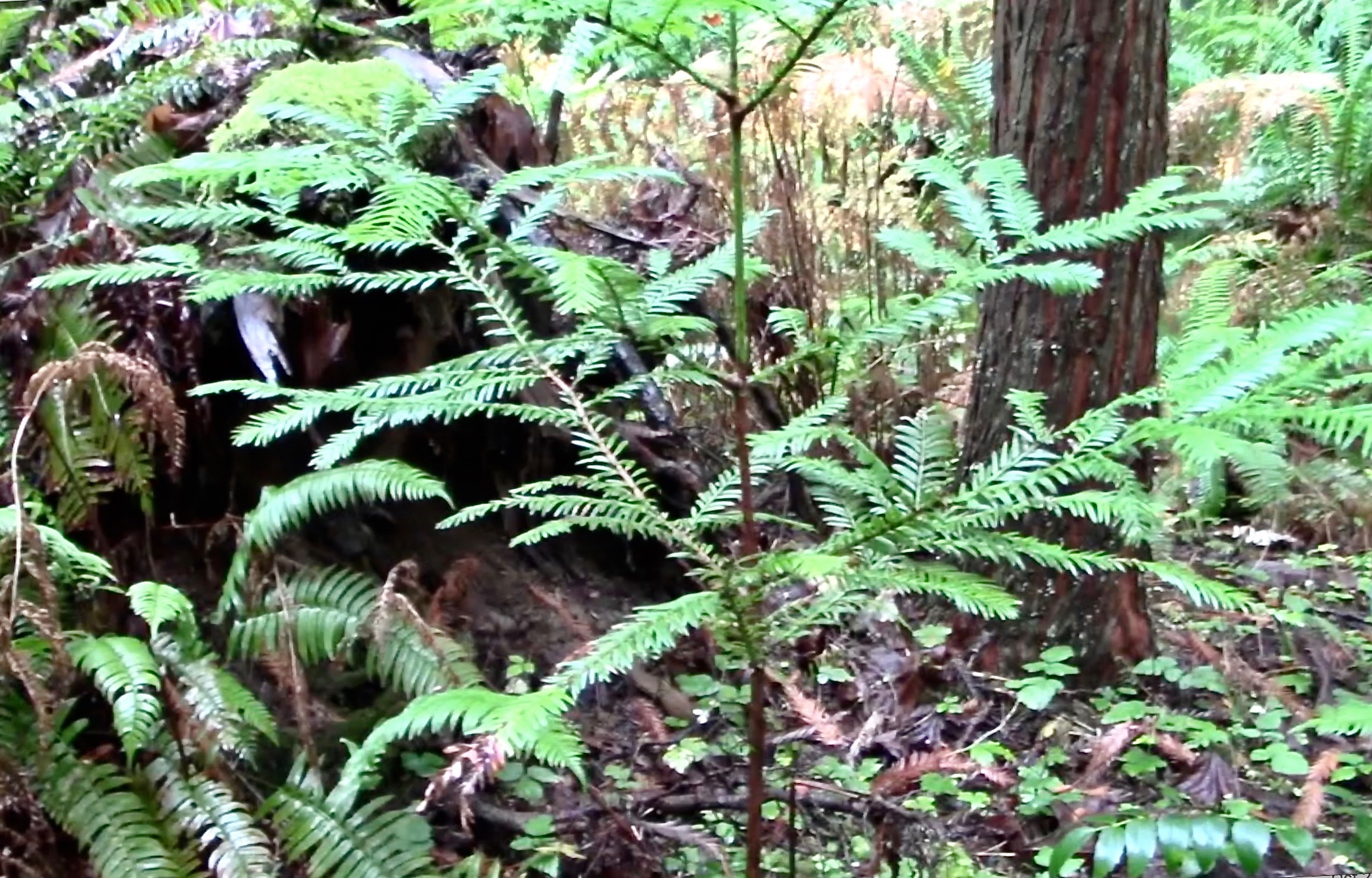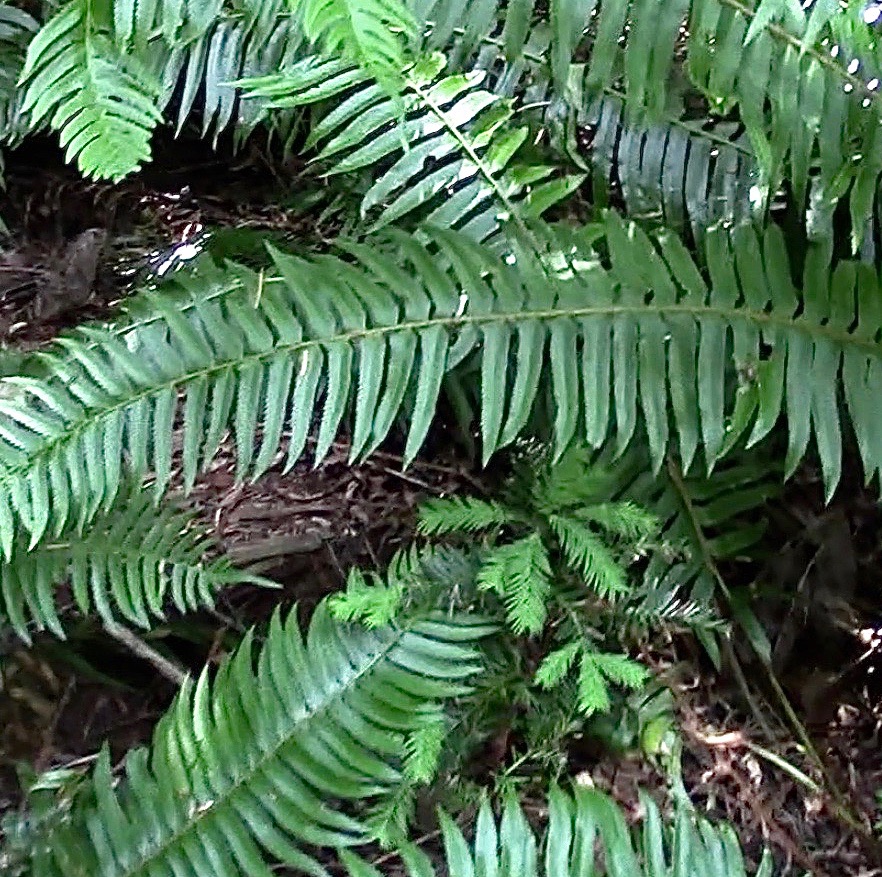 ABOVE LEFT: At Hutt Park north of Seattle, a seedling redwood benefits from moist conditions beneath Swordfern.ABOVE RIGHT: At Seabeck WA (along the west side of Puget Sound), a sapling redwood rises among the Swordfern. Coast Redwoods utilize the same form of mycorrhizal fungi (arbuscular) as do all ferns. Western Redcedar is also of the same type. In contrast, Douglas-fir and Western Hemlock form mutualistic relationships with ecto-mycorrhizal fungal types.