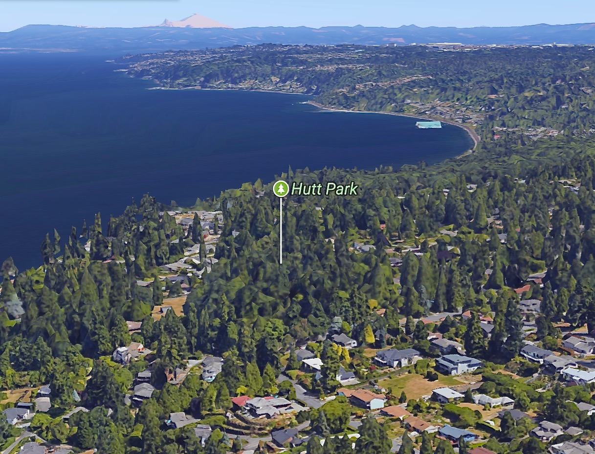 • PROTECTION FROM STRONG WINDS. Being close to cold marine waters can help maximize summer fog conditions, but gale-force winds will blow the tops off redwoods that rise above their neighboring Douglas-fir. The images above show these conditions at Hutt Park.ABOVE LEFT: Hutt Park was originally an estate north of Seattle that then became a regrowth forest park. Two Coast Redwoods had been planted on the estate, and they quickly rose above the neighboring Douglas-fir and Western Redcedar. Because this park is along the eastern shore of Puget Sound, it is exposed to gale-force winds. (Mount Baker is the white mountain in the distance. This image is taken from Google Maps, satellite view, with 3D option.)• MINIMIZE AFTERNOON SUN INTENSITY. Because summers in Seattle are also becoming hotter and drier, it may be helpful to site trees in locations where morning sun is direct but hot afternoon sun is reduced. If you have access to an east-facing slope of mountain, hill, or ravine, that would be helpful. If not, then it could be helpful to find a planting site where an existing forest edge offers late afternoon shade.ABOVE RIGHT: One of the mature redwoods at Hutt Park has already lost its top.