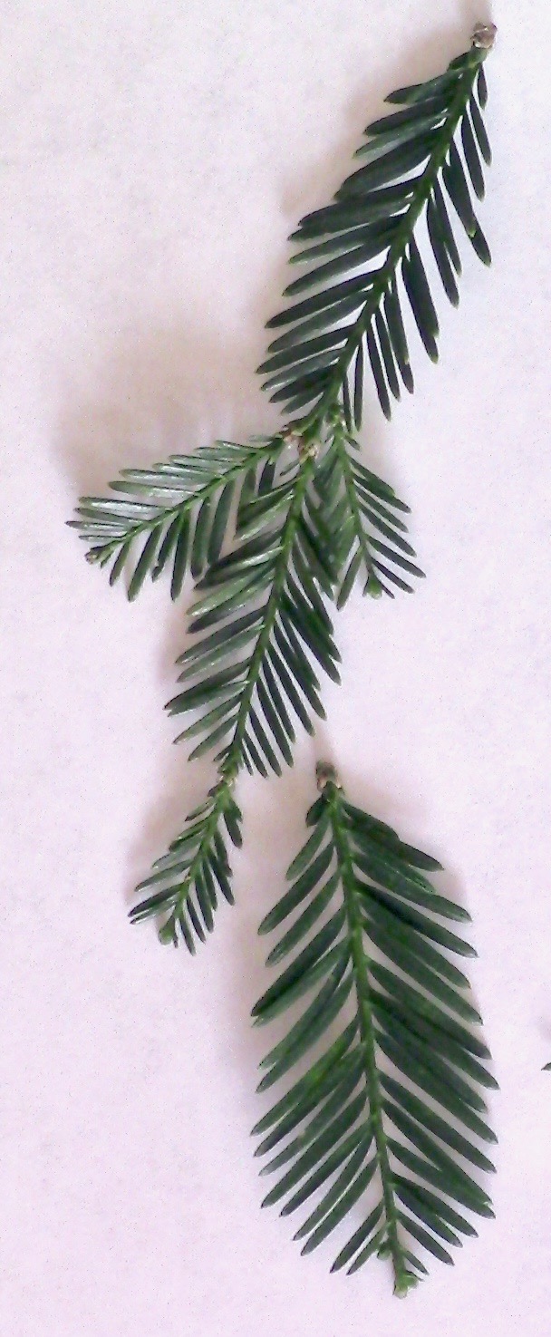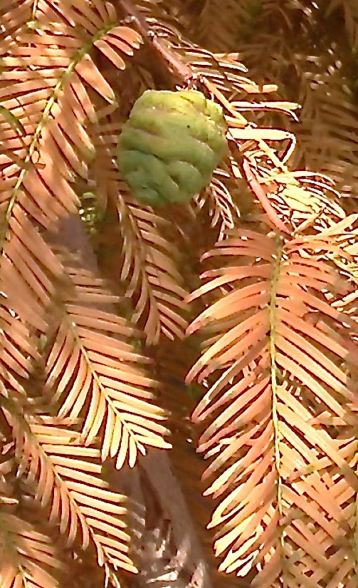 ABOVE: Distinguishing the leaves of Giant Sequoia (left), Dawn Redwood (center) and Coast Redwood (right).Notice how the leaves of Dawn Redwood appear symmetrical, as they are opposite of one another, while the leaves of Coast Redwood are alternate. Dawn redwood is uniquely deciduous, thus its bronze leaves here will soon be falling, leaving the branches bare in winter, as are the branches of its close relative of the eastern USA, Bald Cypress, genus Taxodium.
