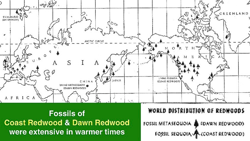 RANGE MAPS: Compare today's very limited range of Coast Redwood and Giant Sequoia with fossil evidence of ranges in warmer times: