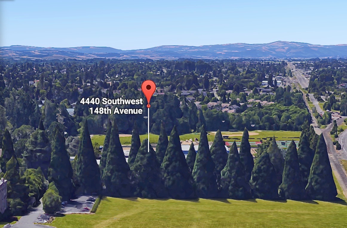 ABOVE LEFT shows the thick cone-shaped top typical of Giant Sequoia (versus the Douglas-fir alongside). ABOVE RIGHT is the 3D feature of satellite view on Google maps showing double row of Giant Sequoias at Valley Catholic School in Portland.