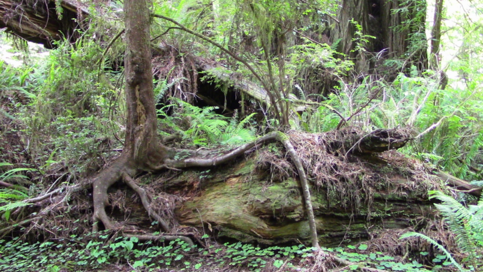 LEFT: Rarely does one see a WESTERN HEMLOCK (center) standing its own ground in an old-growth redwood forest. BELOW: However, Western Hemlock has no rival when it comes to quickly occupying the top surface of a fallen giant, where a spot in the sun is guaranteed at least for awhile.