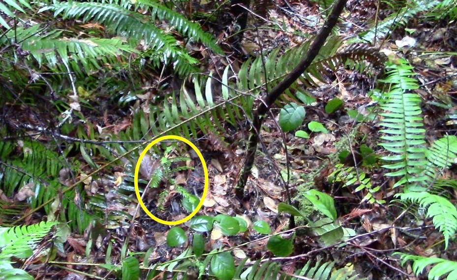 BELOW: The youngest offspring that Connie located within the Seabeck forest is encircled below, with a close-up photo alongside. The crooked dark stem rising to its right is a sapling redwood. Both are growing in dense evergreen shade.![]()