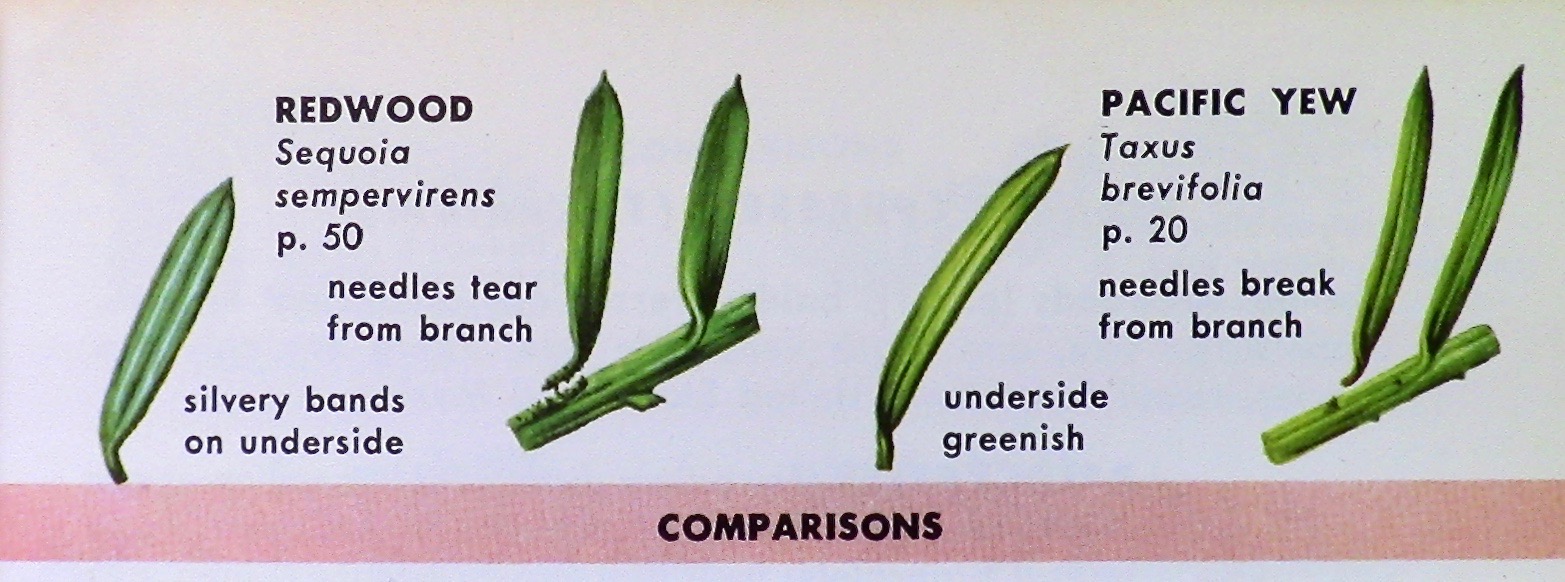 at Seabeck WALEFT and ABOVE: The only native plant that can be confused with Coast Redwood is Pacific Yew but only when redwood is a seedling or sapling growing (as Pacific Yew always does) in subcanopy shade. In both images, Redwood is at left. Connie Barlow finds that the leaf-pull technique is the most trustworthy test: a pulled redwood leaf brings a trail of stem covering at its base.
