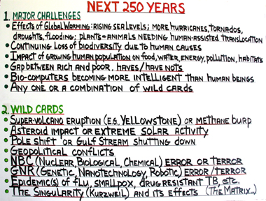 Effects of Global Warming: rising sea level; intensity/frequency of hurricanes, tornados, droughts, flooding; plants and animals needing human-assisted translocation Continuing loss of biodiversity due to human causes Impact of growing human population on food, energy, pollution, habitats Gap between the rich and poor, haves/have nots Bio-computers becoming more intelligent that human beings Any one or a combination of wild cards 2. WILD CARDS