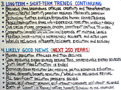 Bad news, chaos, breakdowns catalyze creativity and transformation Organic/Nested Creativity paradigm replaces Mechanistic paradigm Technology further enables/empowers human connectedness People/organizations share information and experience more often, more widely, and more deeply Circles of care, compassion, concern, and commitment continue to widen Cooperation (interdependence/nonzero: win-win, lose-lose) expands at multiple levels Feedback (inner and outer) is increasing accurate and helpful World's religions integrate/celebrate evolution and ecology 4. LIKELY GOOD NEWS (NEXT 250 YEARS)