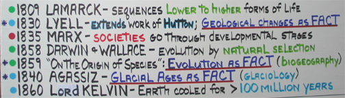 Major discoveries revealing the depths of time and the major events in the 14 billion year story of cosmic, Earth, life, and human cultural creativity. Red signifies discoveries in human culture; turquoise the Earth sciences, green the life sciences, and yellow the astronomical sciences. Dark blue (with red underline) highlights the key episodes that brought about huge new factual understandings. (Michael Dowd and Connie Barlow constructed this list from various sources.)Return to main list of Great Story CHARTS.
