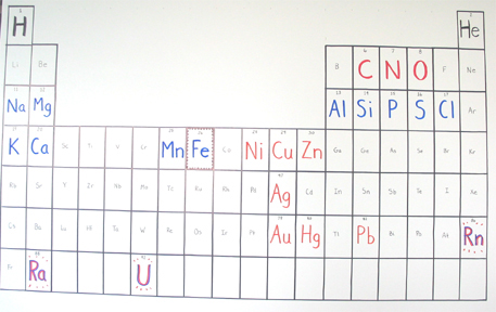 to show commonly known elements, color-coded by stellar origin.