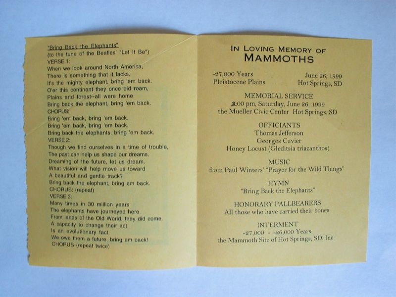 On 26 June 1999, Connie Barlow joined Pleistocene ecologist Paul S. Martin and mammoth paleontologist Larry Agenbroad, and others, at the Mammoth Site near Hot Springs, South Dakota, to conduct possibly the world's very first memorial service for an extinct beast of the Pleistocene.