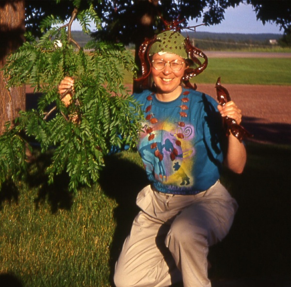 CONNIE BARLOW (left) served as emcee of the memorial service. She also dressed in the guise of Honey Locust (left), who delivered a eulogy to the mammoth as Honey Locust was mourning the loss of her seed dispersal partner. Note: Connie's 2001 book, The Ghosts of Evolution, below, tells the story of the coevolution of mammoths and honey locust trees in North America.