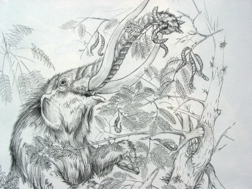 Pictured below is an artist's rendition of an American Mastodon harvesting the sugary seedpods of Honey Locust, Gleditsia triacanthos. The drawing appears in Connie's essay published in a 2001 issue of Natural History Magazine. You can access in PDF "Ghost Stories of the Ice Age".