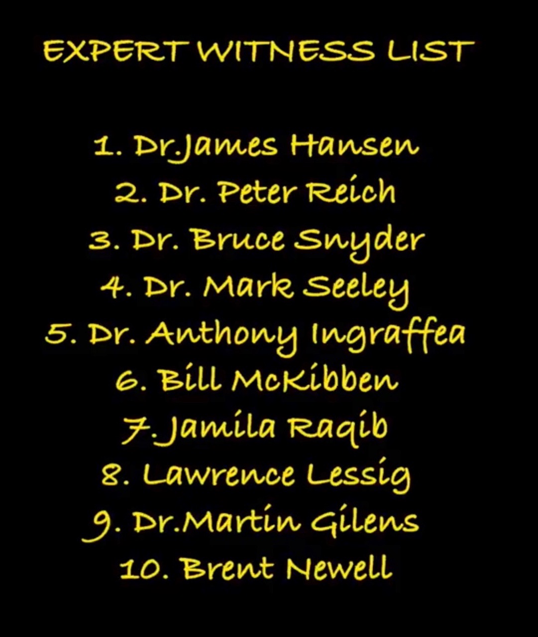 Experts that had planned to testify include climate scientists Dr. Jim Hansen, Dr. Mark Seeley, and Dr. Peter Reich; public health expert Dr. Bruce Synder; Princeton professor Dr. Martin Gilens; Harvard Law professor Lawrence Lessig; nonviolent direct action historian and Albert Einstein Institution executive director Jamila Raqib; 350.org co-founder Bill McKibben; and oil infrastructure expert Dr. Anthony Ingraffea.