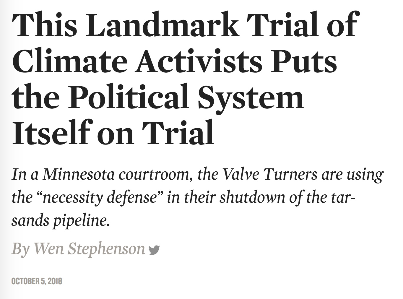 •*** "This Landmark Trial of Climate Activists Puts the Political System Itself on Trial", by Wen Stephenson, 5 October 2018, The Nation, 3,400 words
